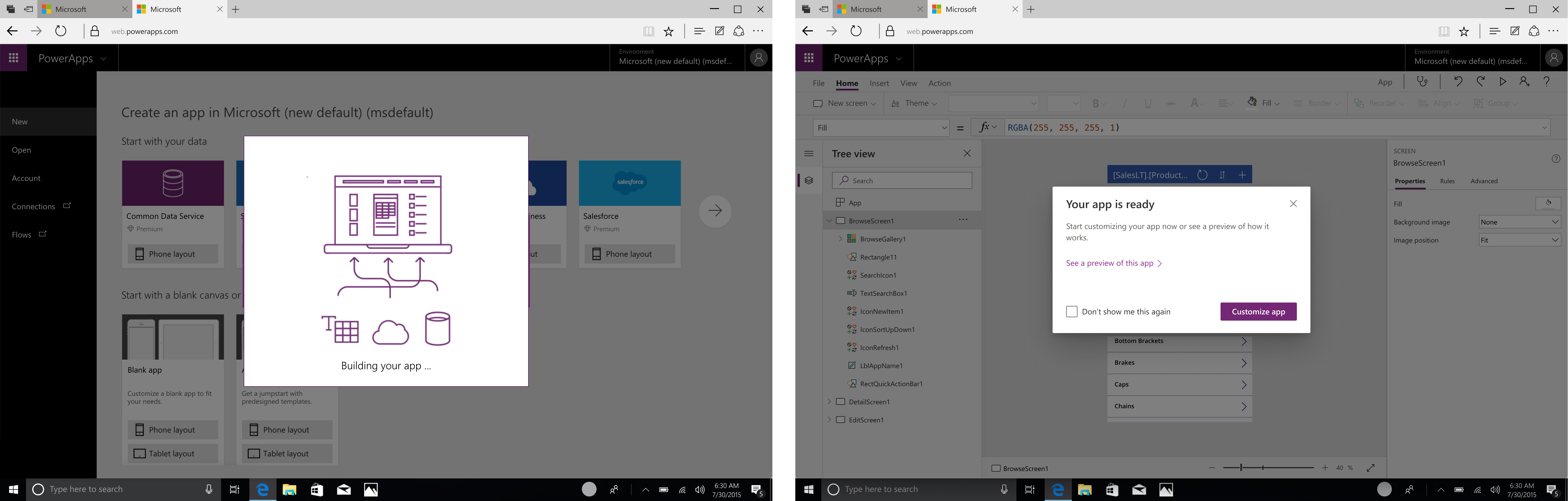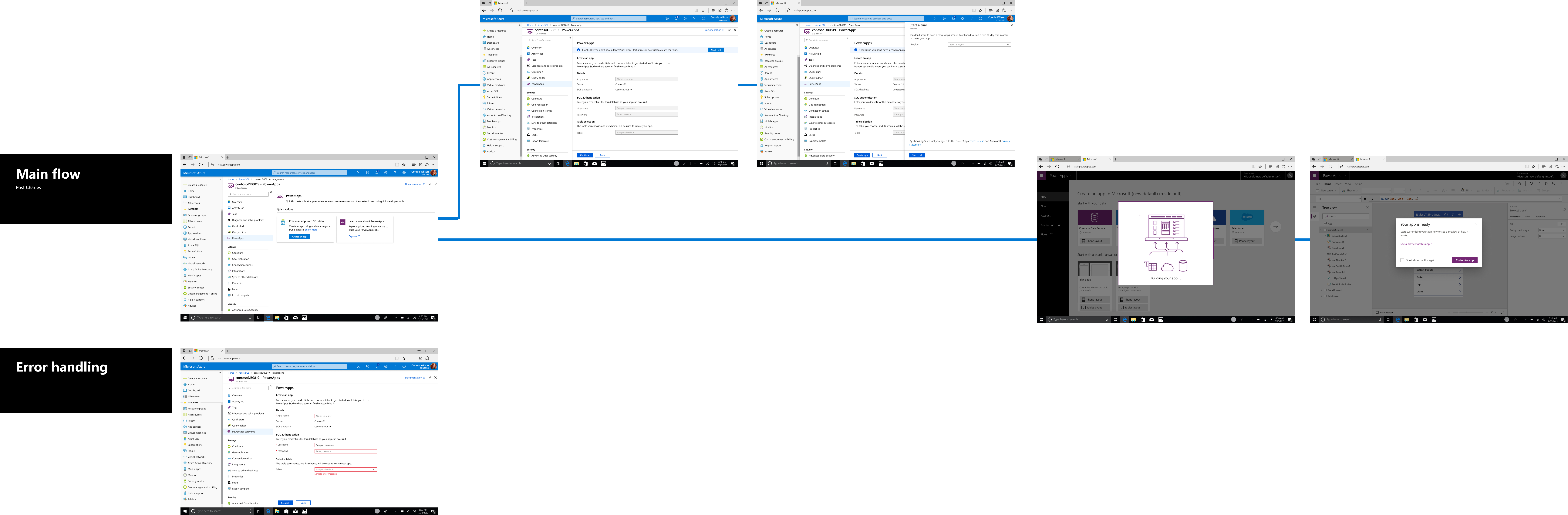 By bringing the trial experience into Azure, we were able to skip a redirect to the true PowerApps "start a trial" page to make it feel like a direct create experience from Azure to PowerApps. Utilizing existing patterns, shown is the visualization of the current loading experience, then the dialog that the user would see after their app is successfully generated.