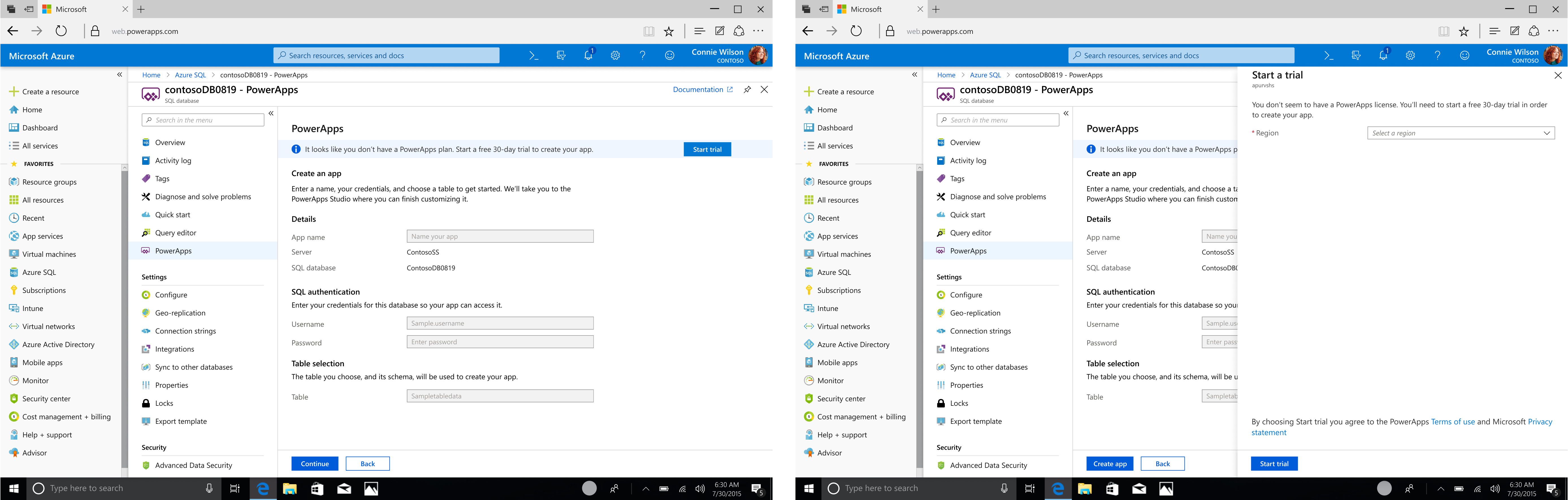 When you click the CTA, "Create an app", you can potentially be blocked by not having a license that enables you to use Power Apps. Although Azure didn't have unified guidance on licensing/trial notifications, we were able to supply trial messaging behavior guidance work I had worked on in the past for our design org. Azure's surfaces were definitely unique to interpret coming from a Fluent-based product.