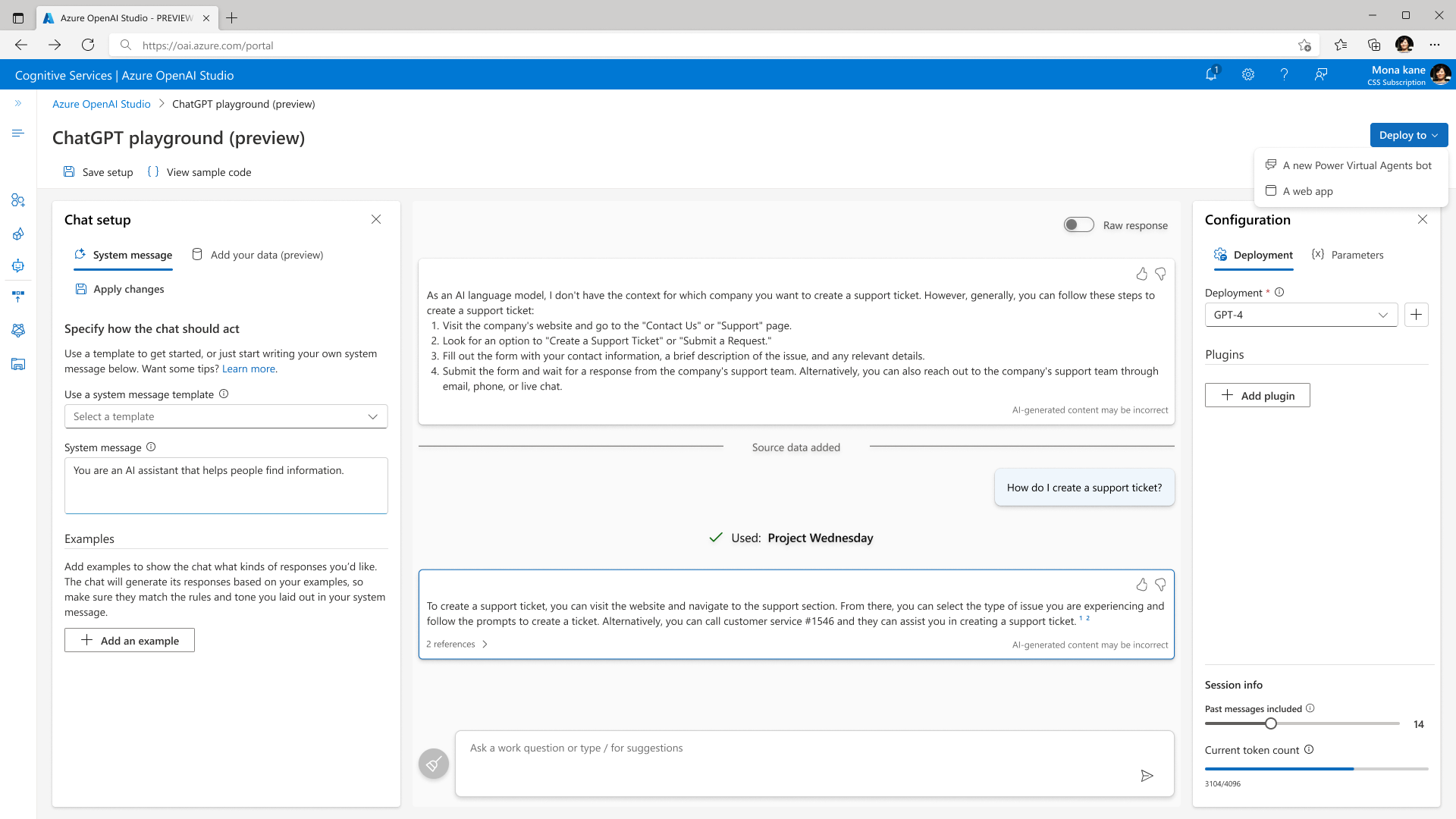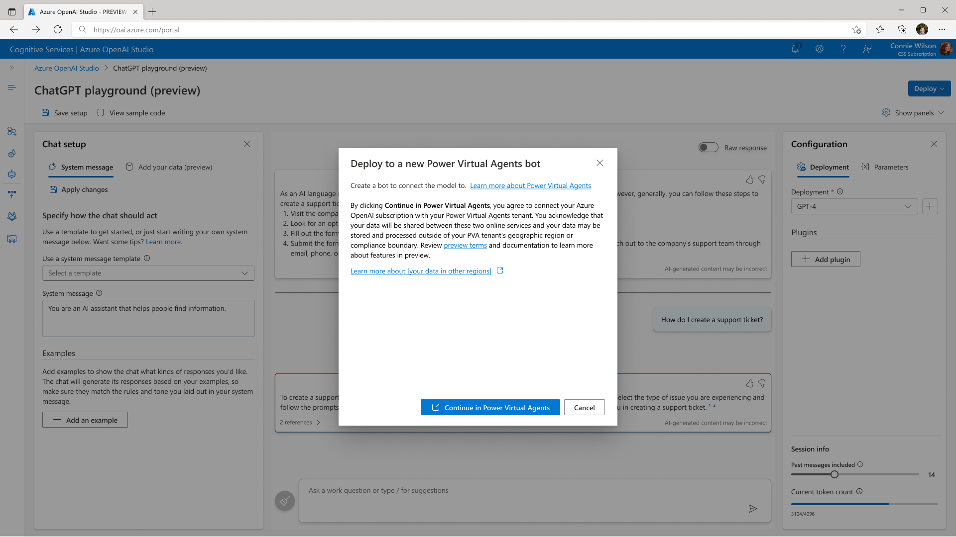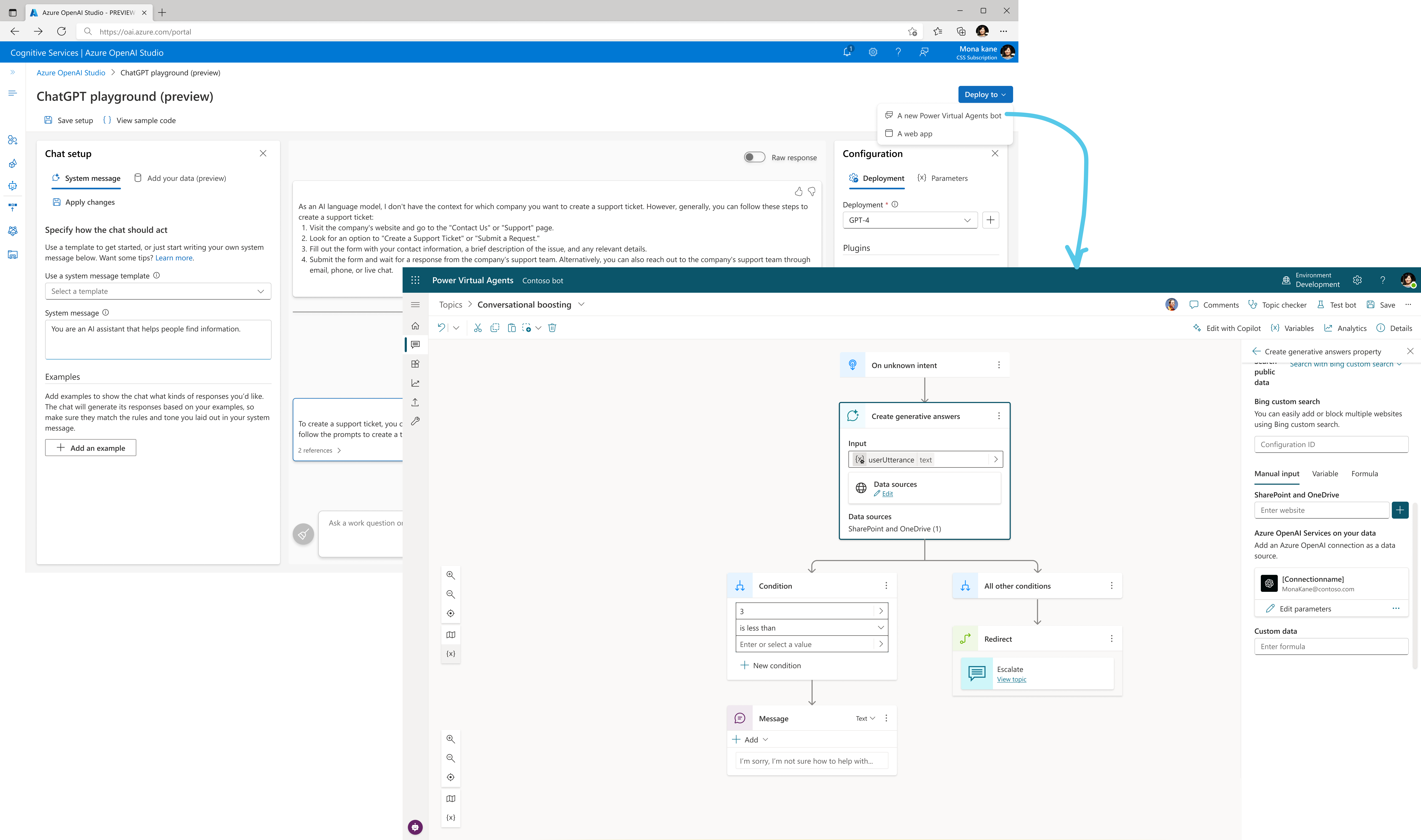 At this point in my career, integration flows in the Power Platform are rather familiar to me; some past and valid research is top of mind when thinking about the initial flow: starting in Azure OpenAI Studio, and somehow getting the user to the PVA authoring canvas, and vice versa.