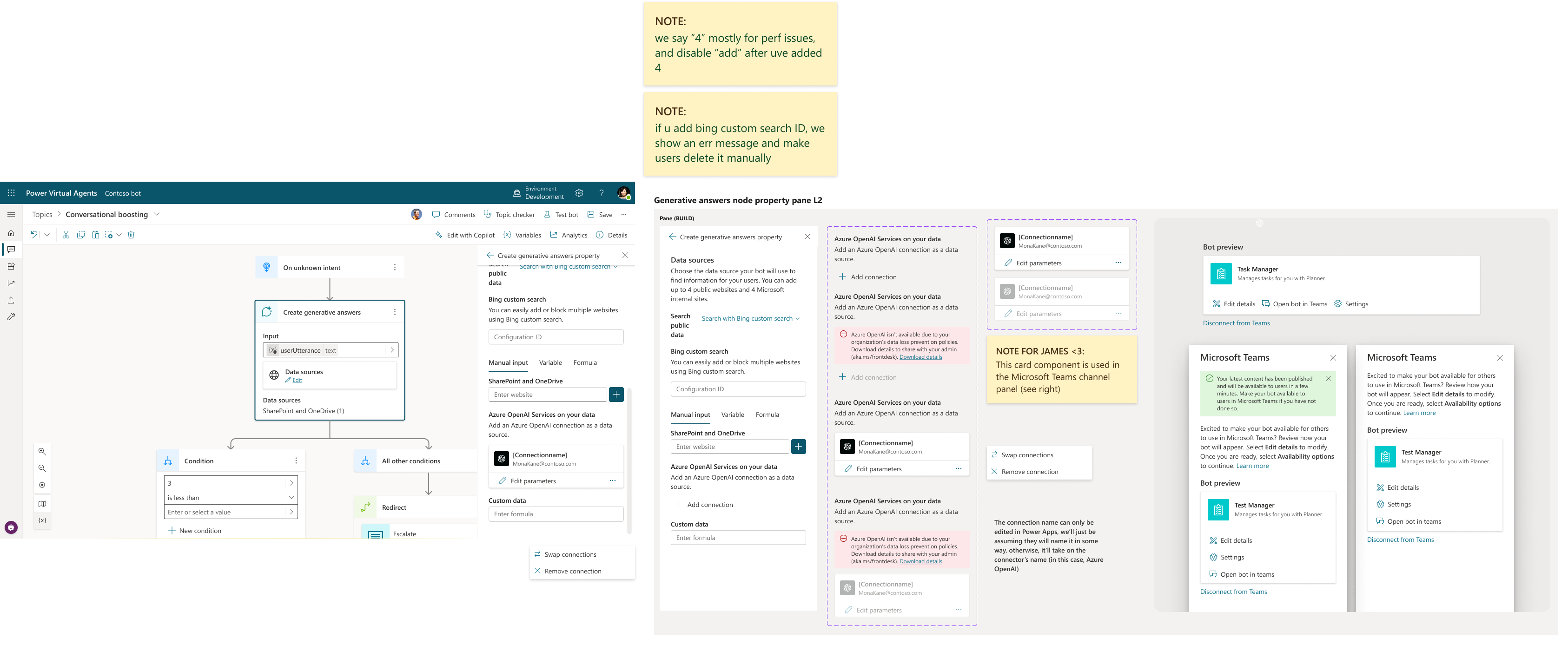 We also had some other questions about how exactly this space worked, since we were starting to consider how, as a connector, Azure OpenAI Studio will need to have input and output variables represented in the authoring canvas. At this point, since I'd worked on an integration piece in Azure before, I reached out to some old buddies to see if we could get an Azure designer's input, since Azure's design patterns and reasonings are unique.
