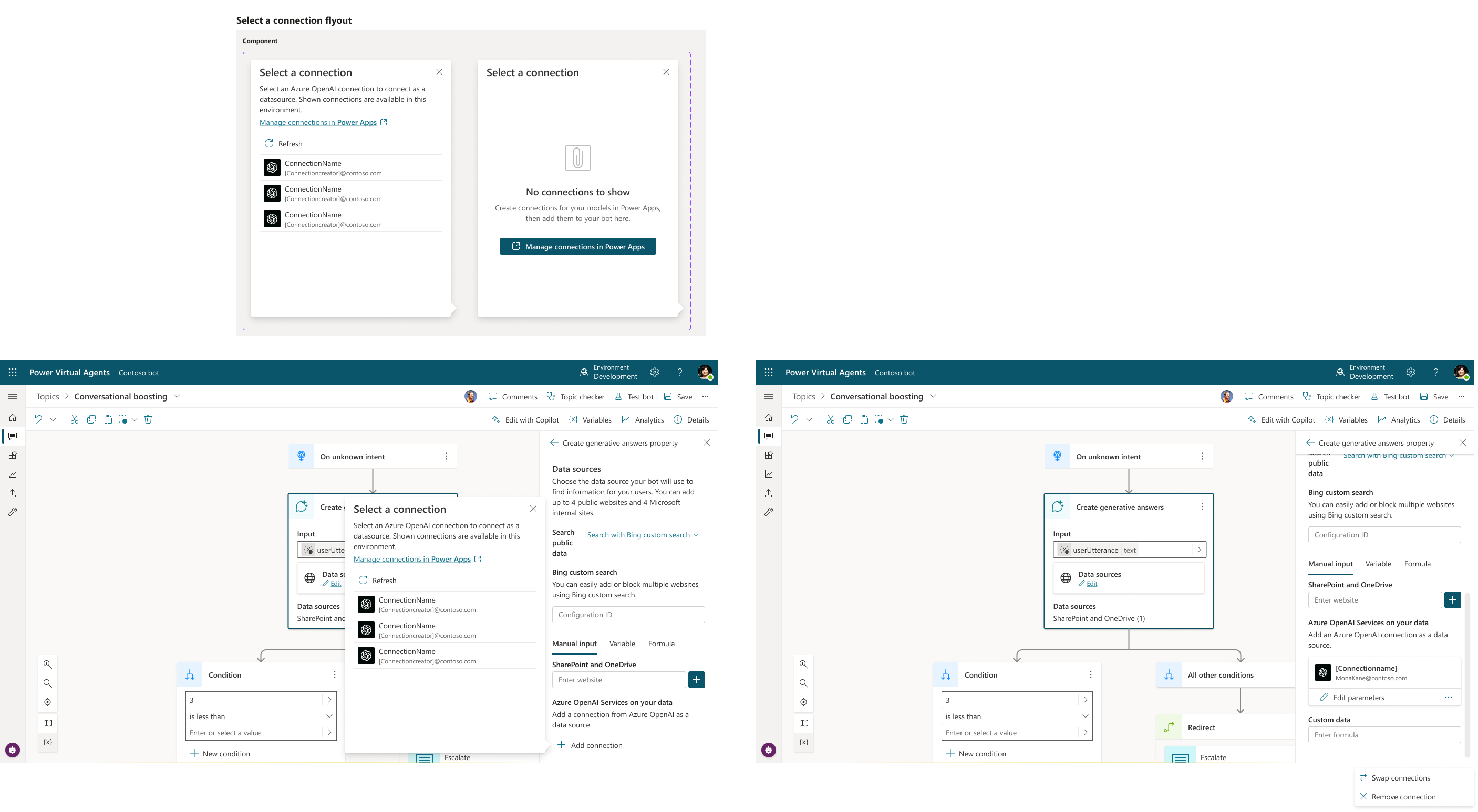 Similar to the screen above, we knew that starting from PVA would require using this pane and approximately this experience in the authoring canvas. Some questions came to mind here about, how do we review all the data-sources in this pane? How can we make this pane more scalable? How can we enable the creation of connections from here, and selecting the right model from Azure OpenAI Studio from here?
