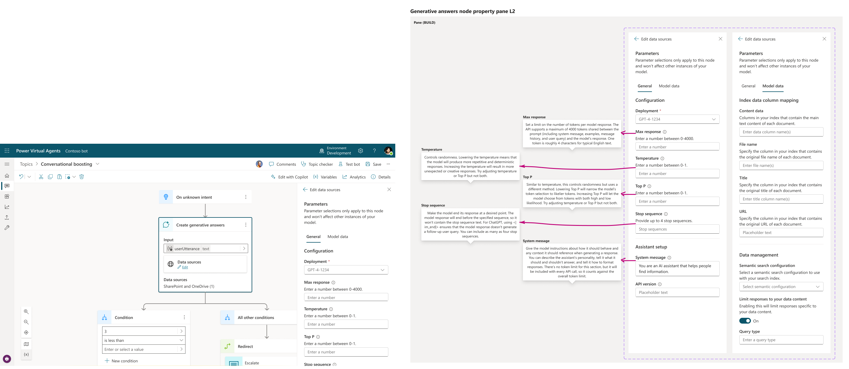 "Parameters" is a term used in Azure OpenAI Studio to describe any configuration on the model. These parameters are mostly in the right pane of Azure OpenAI Studio, but can exist in other hidden areas of that page. We consolidated them here to allow the user to edit the model without leaving the context of PVA, and also gave a disclaimer that editing here doesn't edit the model, but just this instance used in the bot.
