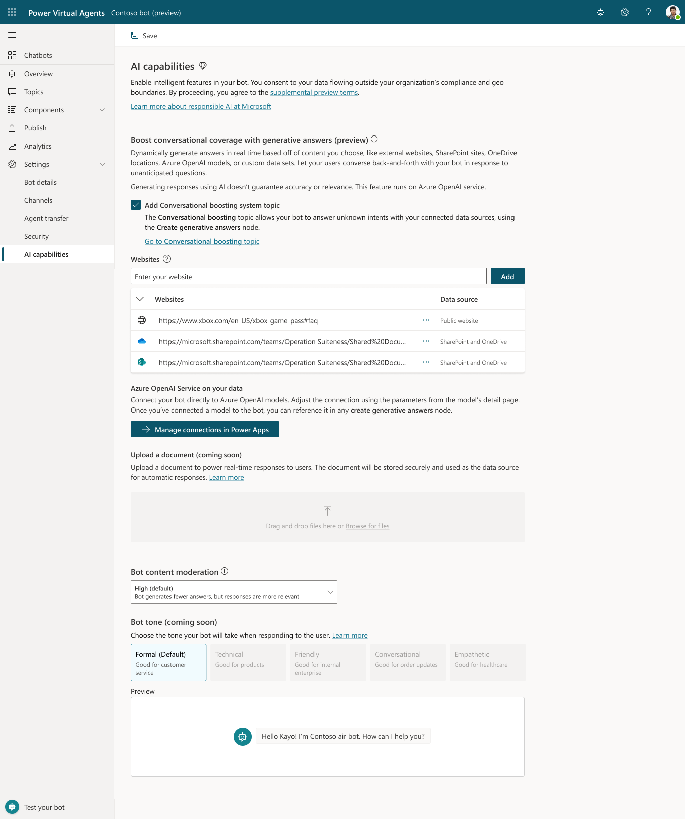 This work was PVA's first step towards exploring generative AI, and how it can create a bot. This feature explores connecting PVA using a an API connector service to Azure OpenAI Studio, and pushing it fully through to a "generative AI" node in the authoring canvas.