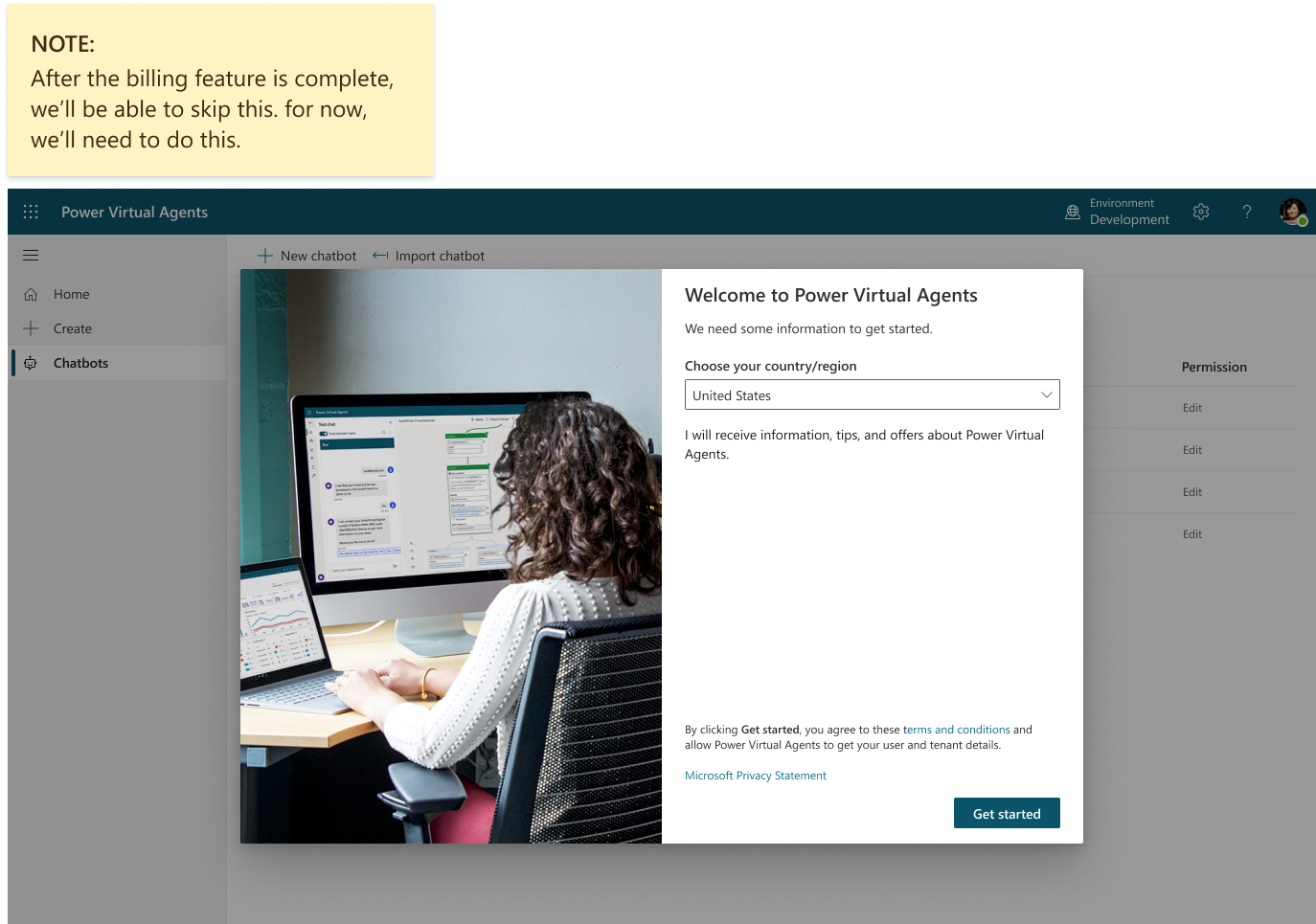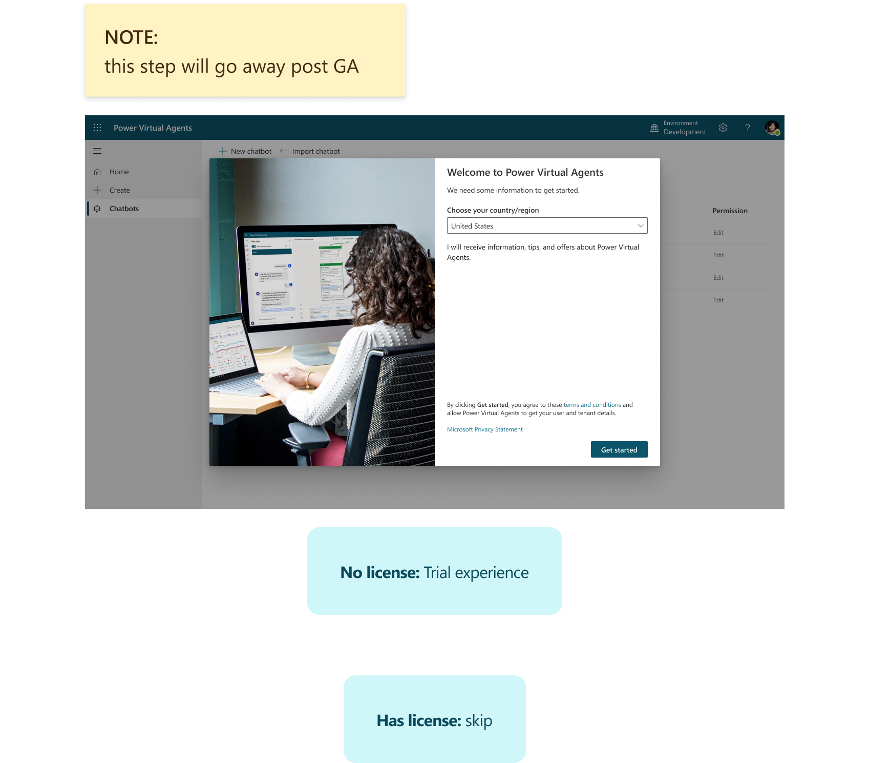 Here I just grabbed an existing experience for what we show when a user doesn't have a PVA license. This, at the bare minimum, we knew users would have to encounter, at least until post GA (general availability). If the user somehow has a PVA license (which research showed most Azure users did not have PVA licsenses) we skip this step.